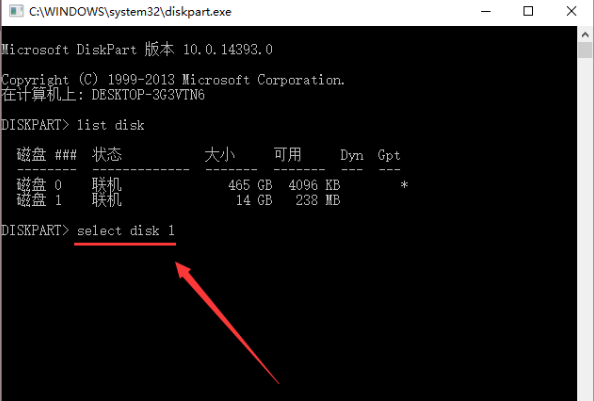 4、再輸入命令select disk 1(大家注意空格),意思就是選中磁盤1,也就是我的U盤,按回車。