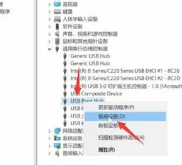 3、 繼續(xù)展開該選項(xiàng),右鍵任意一個(gè)USB Root Hub,選擇禁用設(shè)備。