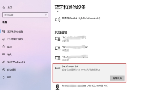3、我們在左邊欄目中選擇藍牙和其他設備,隨后在右側的列表中我們能夠看到U盤,點一下刪除設備。