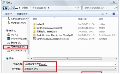 3.點(diǎn)擊“文件——另存為”,把代碼的文檔存到我們丟失文件的U盤,保存類型選擇“所有文件”;