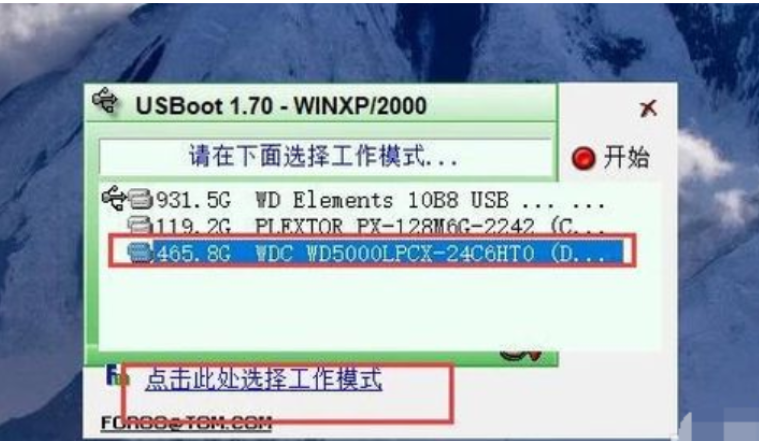 4、選中需要進(jìn)行修復(fù)操作的U盤設(shè)備,點擊“選擇工作模式”選項。