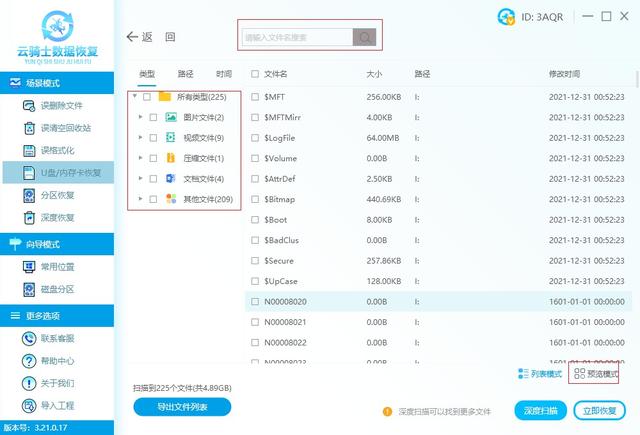 官網(wǎng)下載云騎士數(shù)據(jù)恢復(fù)軟件,安裝后運(yùn)行軟件,將 U 盤(pán)通過(guò) USB 接口連接電腦,選擇軟件界面中的 u 盤(pán)/內(nèi)存卡恢復(fù)模式,即可看到 U 盤(pán)及 U 盤(pán)上的分區(qū)信息會(huì)在軟件中顯示出來(lái)。