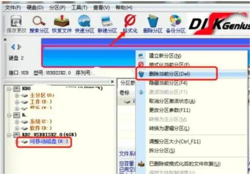 1、第一步先排除U盤軟故障的問題,再將U盤插入電腦的USB口,然后打開DISKGEN磁盤實(shí)用軟件主界面,右擊U盤選項,選擇“刪除當(dāng)前分區(qū)” ,再“新建分區(qū)”,最后格式化U盤。