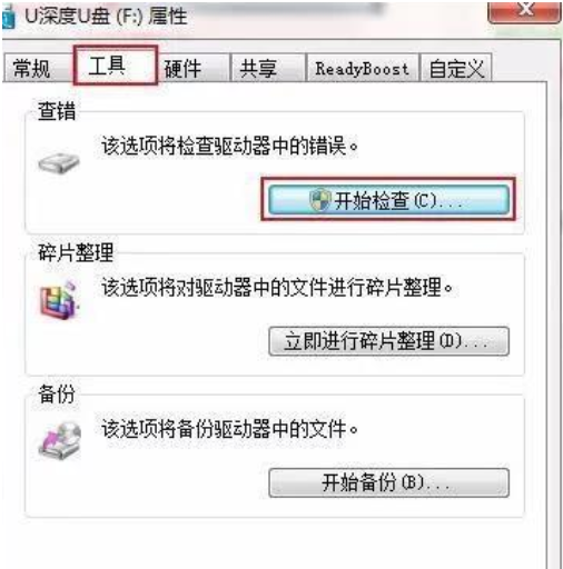 2.我們在打開的屬性窗口當(dāng)中,選擇“工具”然后點擊“開始檢查”按鈕。