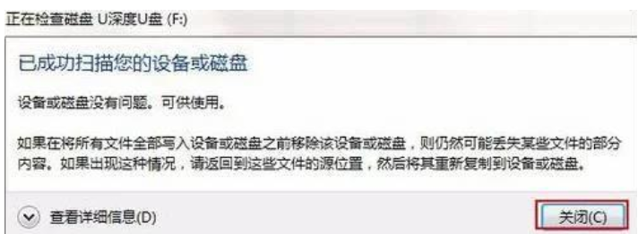4.最后檢查完成會彈出結(jié)果,我們點擊“關(guān)閉”即可修復(fù)好u盤文件打不開的現(xiàn)象。