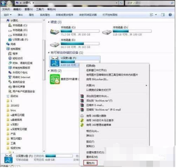 1.當(dāng)遇到u盤文件打不開時,首先我們將u盤插到usb接口處,然后將鼠標(biāo)移動到u盤圖標(biāo)當(dāng)中,鼠標(biāo)右鍵點擊“屬性”。