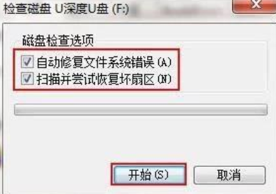 3.彈出磁盤檢查的窗口后,我們將下方兩個選項都進行勾選,最后點擊“開始”按鈕,耐心等待完成即可。