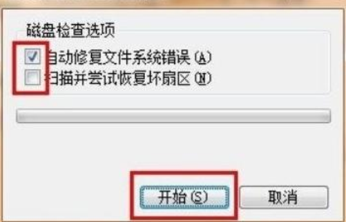 3、在彈出的檢查磁盤窗口中,將“自動修復文件系統(tǒng)錯誤”和“掃描并嘗試恢復壞扇區(qū)”兩項全部勾選,然后點擊“開始”進行掃描。