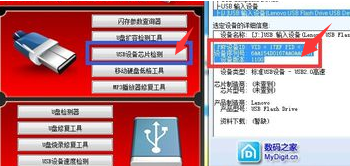 2.鼠標(biāo)雙擊運行“萬能版U盤量產(chǎn)工具”,從彈出的程序主頁面中,點擊“USB設(shè)備芯片檢測”按鈕,即可成功獲得當(dāng)前U盤的設(shè)備信息,其中PID以及VID信息,可以查找與U盤相匹配的量產(chǎn)工具。
