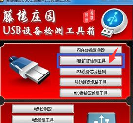 3.跟隨步驟進行操作,點擊“U盤擴容檢測工具”即可自動對當(dāng)前U盤進行擴容檢測,檢測完成即可。