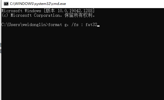 2、在命令提示符窗口界面中輸入“format g:/fs : fat32”并且按回車運行此運算即可。