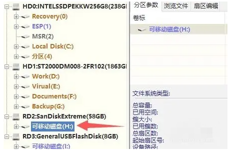 1.打開diskgenius軟件,在左擇胳邊找到并選中需要冷狠修復的u盤。