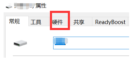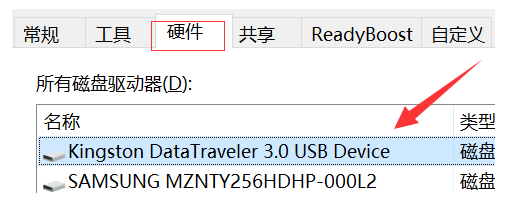 5.在U盤屬性窗口中,找到“硬件”選項(xiàng)”。