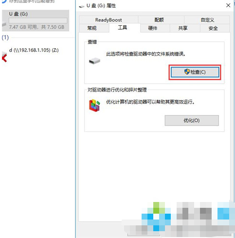 2、在打開的屬性窗口上面鼠標(biāo)點擊工具選項卡,接著在工具選項卡中,鼠標(biāo)點擊檢查。