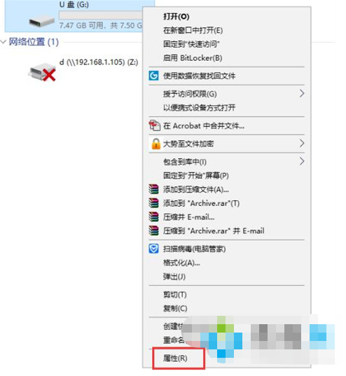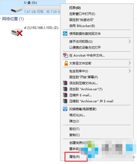 1、一般的邏輯壞道很好進(jìn)行解決,在U盤盤符的上方鼠標(biāo)點擊右鍵,在彈出的窗口界面中點擊屬性。