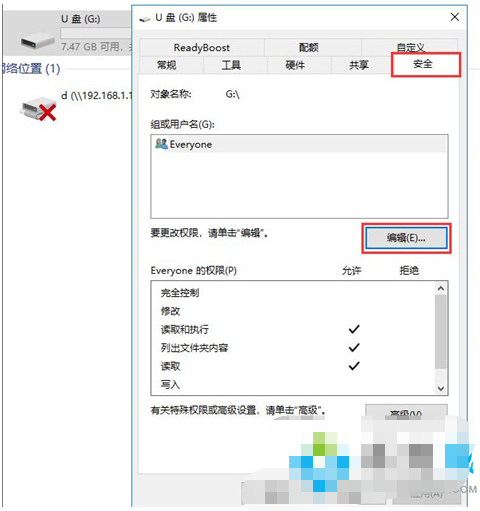 3、在打開的窗口界面上部選中everyone,接著在下方everyone的權(quán)限中勾選完全控制,然后依次點擊確定即可解決無法格式化u盤的問題。