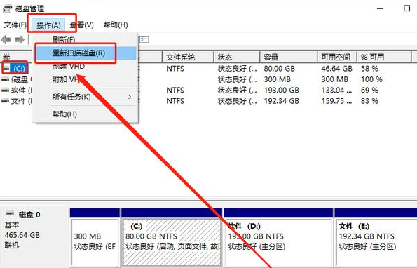 2、磁盤管理界面中選中u盤,鼠標(biāo)點(diǎn)擊工具欄的【操作】,選擇【重新掃描磁盤】后耐心等待修復(fù)即可。