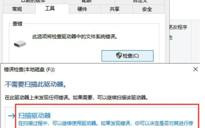 2、在彈出的錯(cuò)誤檢查窗口中點(diǎn)擊“掃描驅(qū)動(dòng)器”,這時(shí)候系統(tǒng)會(huì)自動(dòng)修復(fù)文件系統(tǒng)錯(cuò)誤和掃描并嘗試恢復(fù)壞扇區(qū)。