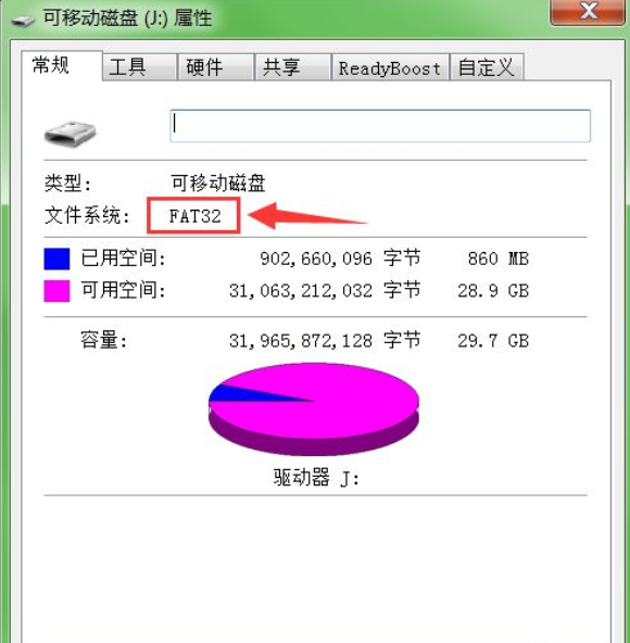 3、此時(shí)即可看到該U盤格式類型為FAT32,這種格式較早,不支持存放超過(guò)4G的文件,需要更改其格式。