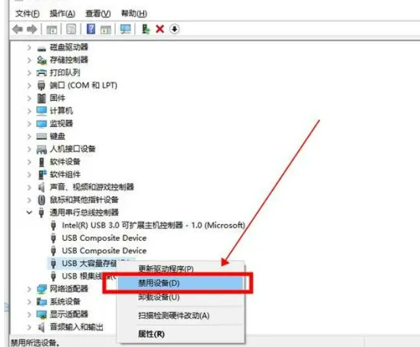 3、通用串行總線控制器下面有個“USB大容量存儲設(shè)備”,右鍵點擊“禁用設(shè)備”即可恢復(fù)。