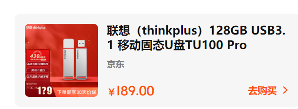 2、聯(lián)想thinkplus TU100 Pro,高性能U盤首選,聯(lián)想作為3C的老牌大廠不用多說,產(chǎn)品質(zhì)量有保障,這款固態(tài)U盤連續(xù)讀取速度可以達(dá)到430M/S,連續(xù)寫入速度400M/S,對(duì)于U盤有性能要求的朋友可以入手。