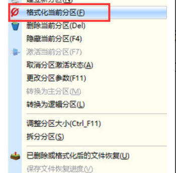 2.選中U盤,右鍵選擇“格式化當(dāng)前分區(qū)”。