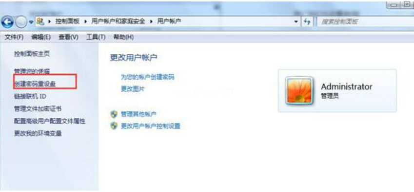 2、在打開的用戶帳戶頁(yè)面中,單擊左側(cè)以創(chuàng)建密碼重置磁盤;