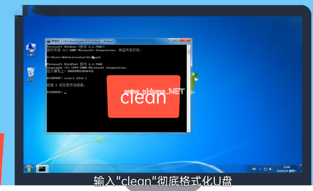 6、然后輸入clean,按回車,格式化u盤。