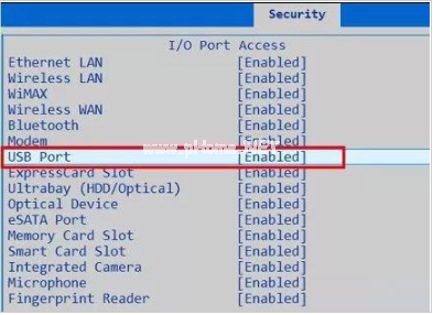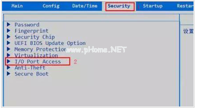 重啟電腦,開機畫面出現(xiàn)時,按下Esc 進入BIOS界面,然后使用方向鍵左右移動至“Security”選項卡,選擇“I/O Port Access”并回車。選中“USB Port”并回車,再將它設置為“Enabled”,最后按下F10保存設置即可。
