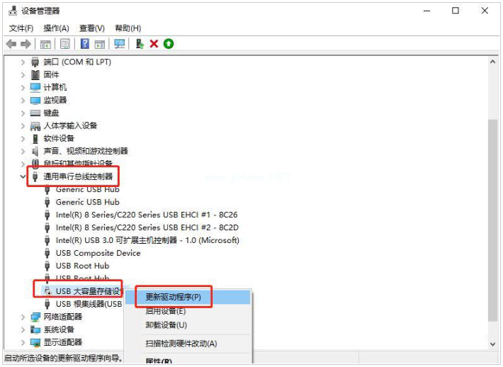 2、選擇“通用串行總線控制器”,右鍵“USB大容量存儲設備”,選擇“更新驅動程序”。