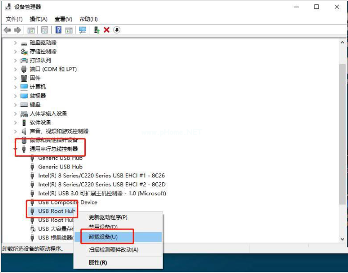 2、選擇“通用串行總線控制器”,右鍵“USB Root Hub”,選擇“卸載”或“刪除”。
