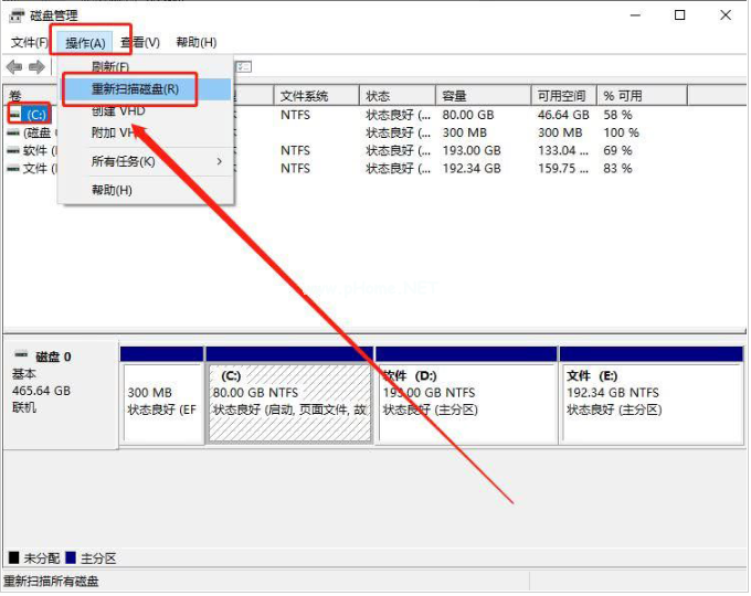 2、依次從C盤開始,選擇磁盤,并點擊工具欄的“操作(A)”,選擇“重新掃描磁盤(R)”即可修復。