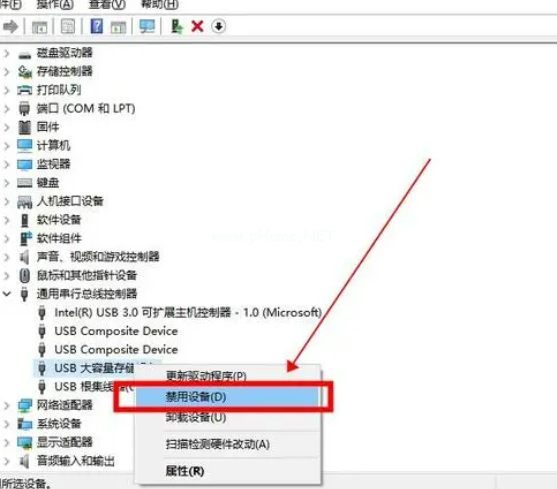 3、通用串行總線控制器下面有個“USB大容量存儲設備”,右鍵點擊“禁用設備”即可恢復。