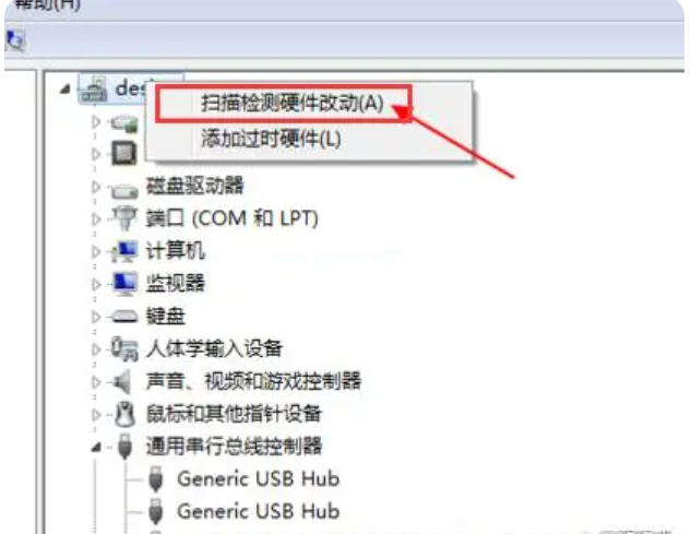 5、卸載完成后再右擊選擇計算機名,選擇“掃描檢測硬件改動”即可