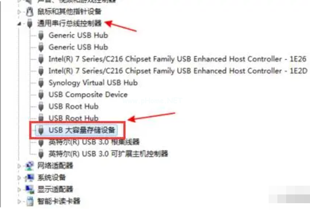 3、在設(shè)備列表中展開,點擊選擇“USB大容量存儲設(shè)備”