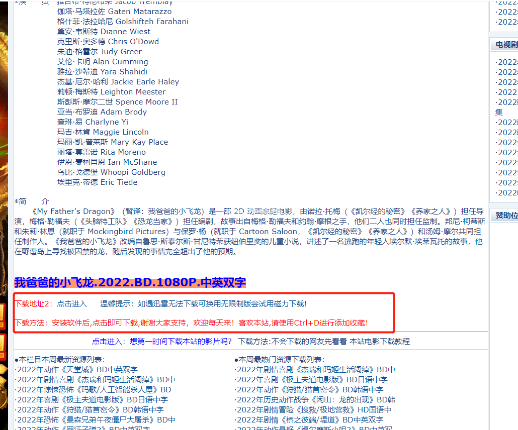 3、選擇需要下載的電影,進(jìn)入電影介紹頁面,往下滑,找到下載地址和下載方式。