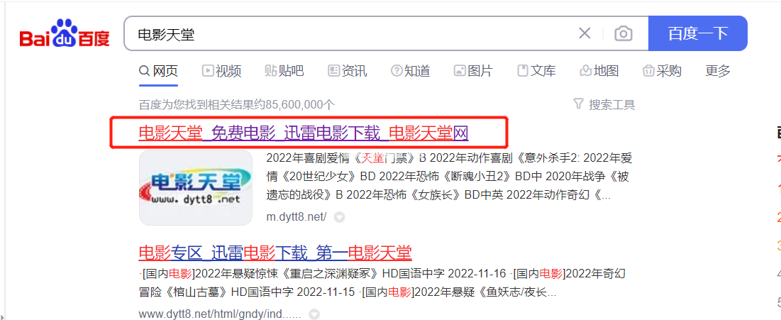 1、打開百度搜索頁面,找到電影天堂,點(diǎn)擊并進(jìn)入。