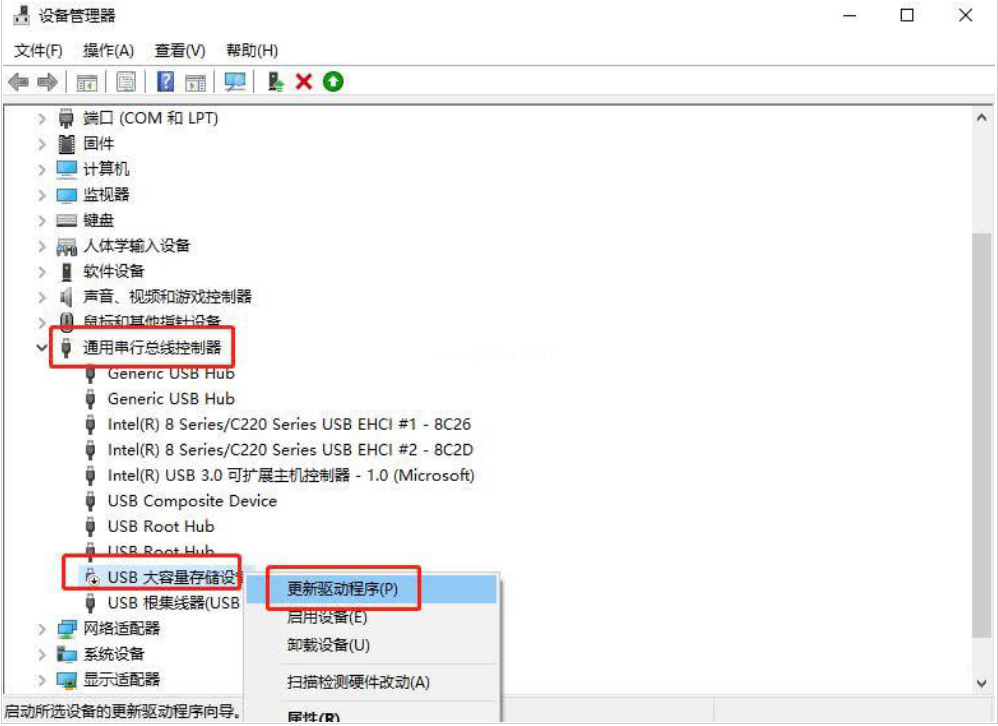 2、選擇“通用串行總線控制器”,右鍵“USB大容量存儲(chǔ)設(shè)備”,選擇“更新驅(qū)動(dòng)程序”。