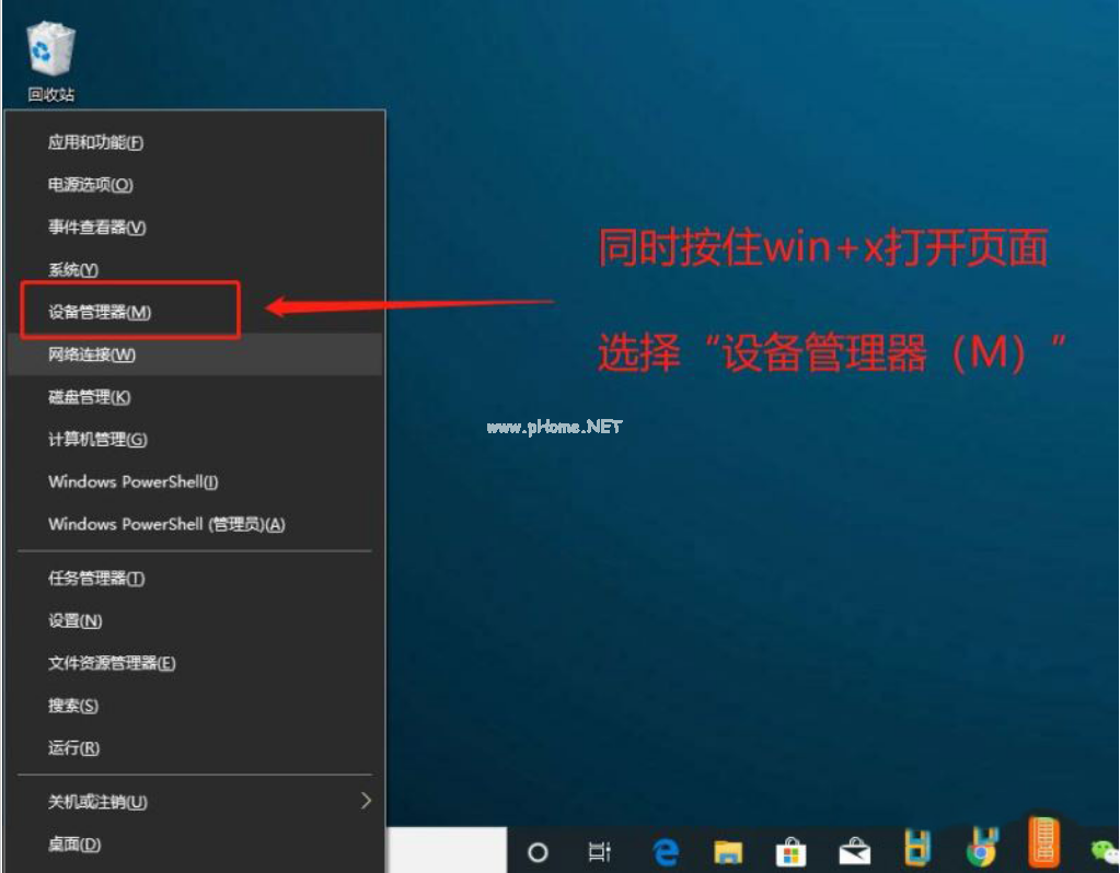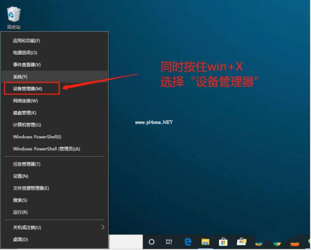 1、同時(shí)按住“win+X”,在彈出的頁(yè)面中選擇“設(shè)備管理器”。