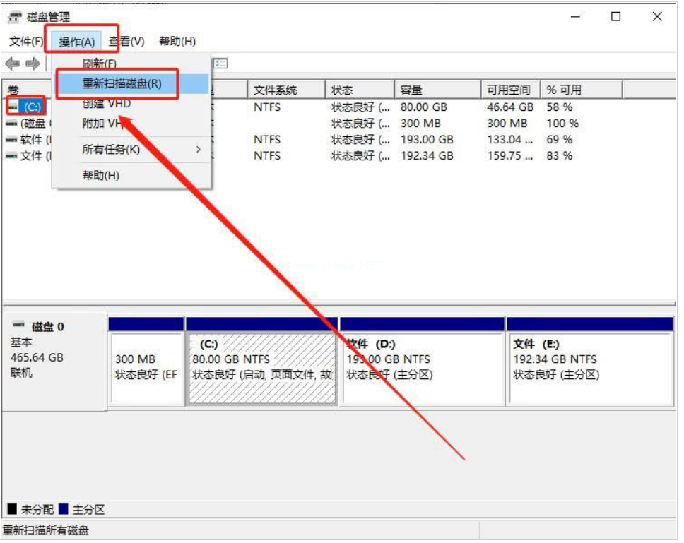 2、在磁盤管理界面中,從C盤開始,逐一選擇磁盤,并點(diǎn)擊工具欄的“操作(A)”,選擇“重新掃描磁盤(R)”。