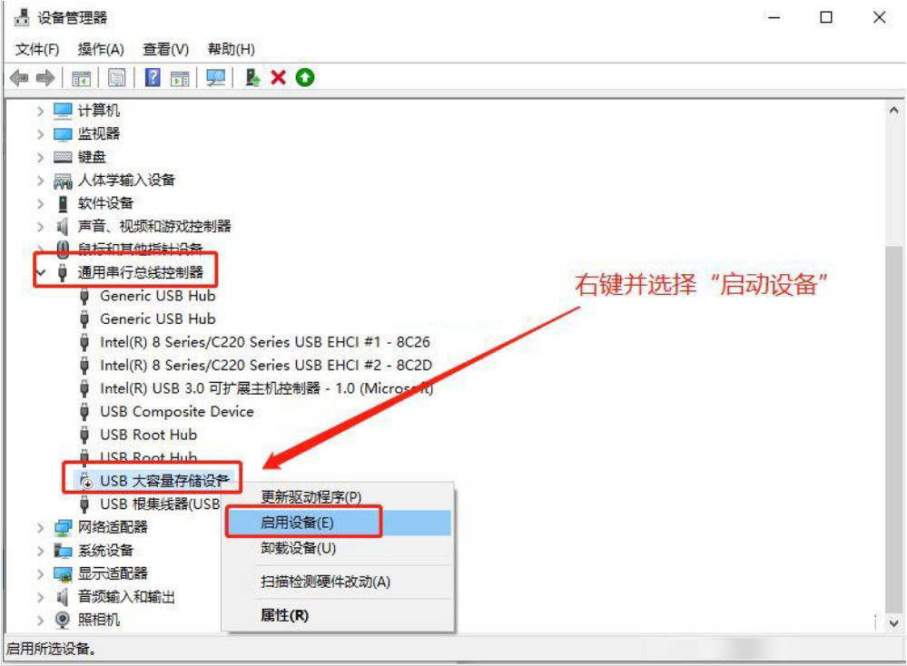 2、設(shè)備管理器界面,右鍵“USB大容量存儲(chǔ)設(shè)備”,選擇“啟用設(shè)備”。