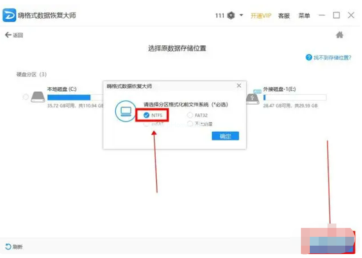 3、點擊分區(qū)格式化前的文件系統(tǒng)并確定,選擇好后點擊“開始掃描”。