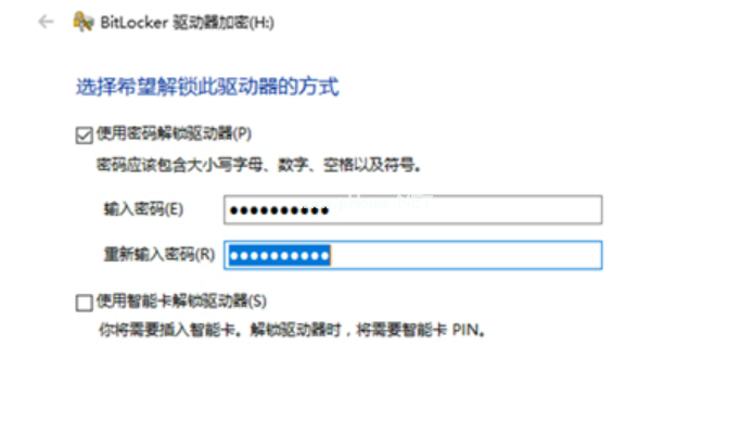 2、選擇解鎖方式,選擇使用密碼解鎖此驅(qū)動(dòng)器,輸入想要設(shè)置的密碼。