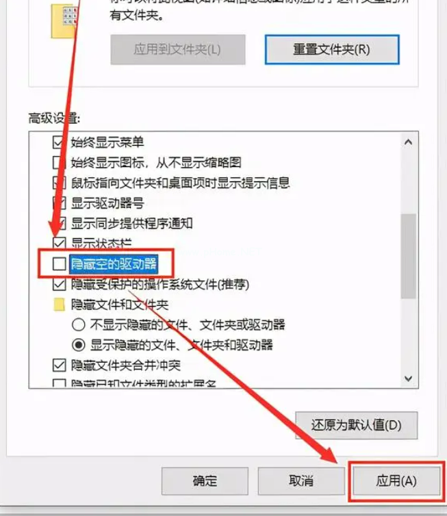 2、打開文件夾選項(xiàng)界面后,點(diǎn)擊切換查看選項(xiàng)卡,取消勾選“隱藏空的驅(qū)動(dòng)器”,點(diǎn)擊“應(yīng)用”即可。