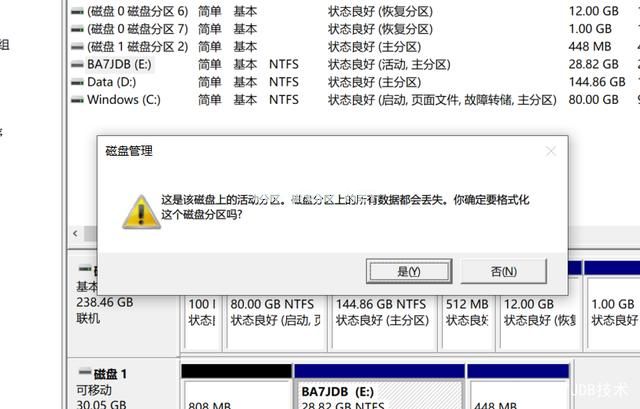 4、在彈出的對話框磁盤管理 ,這是這個磁盤上的活動分區(qū),磁盤分區(qū)上的所有數(shù)據(jù)都會導(dǎo)致丟失,點擊是即可開始格式化磁盤