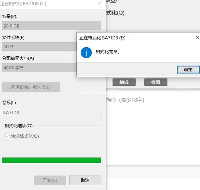 3、打開 格式化BA7JDB(E:)對話框界面 ,容量(P:)指的是顯示您的U盤大小。文件系統(tǒng)(F)是選擇格式化的方式(FAT32、NTFS、exFAT),正常情況下的話是選擇NTFS格式,也可以根據(jù)需要選擇其FAT32或exFAT格式。分配單元大小默認(rèn)就行,點擊確定,耐心等待些時候就格式化好了。