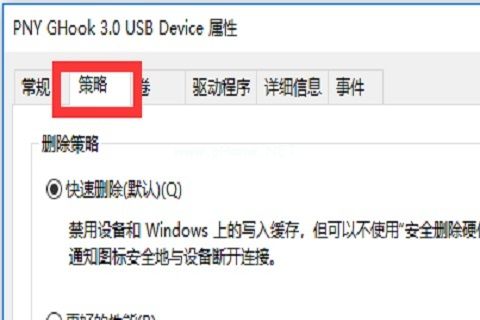 2. 在彈出的窗口界面中選擇“策略”,點擊“更好的性能”,并勾選“啟用設(shè)備上的寫入緩存”選項。