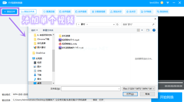 處理單個視頻時,直接點擊左上角“添加文件”即可。