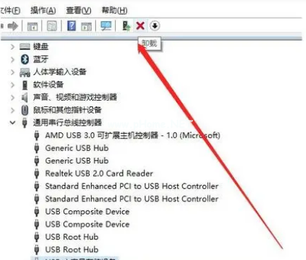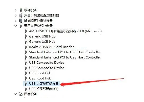 3、在設(shè)備管理器窗口中,點(diǎn)擊展開“通用串行總控制器”,選擇“USB大容量存儲設(shè)備”;