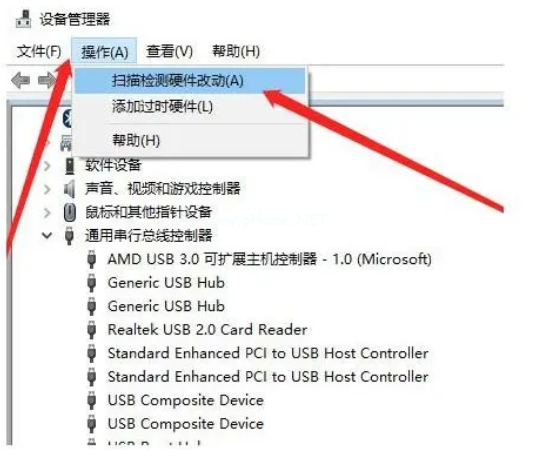 5、再點(diǎn)擊“操作”-“掃描檢測硬件改動”;
